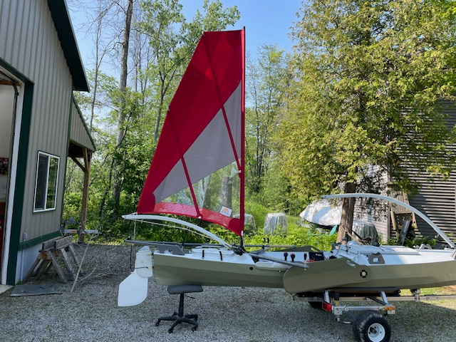 These Hobie Mirage and Adventure Island sails are being used on an Angus Rowcruiser. The Mirage sails is made a bit stronger than the original and given an extra batten to help calm it down when the wind gets strong.